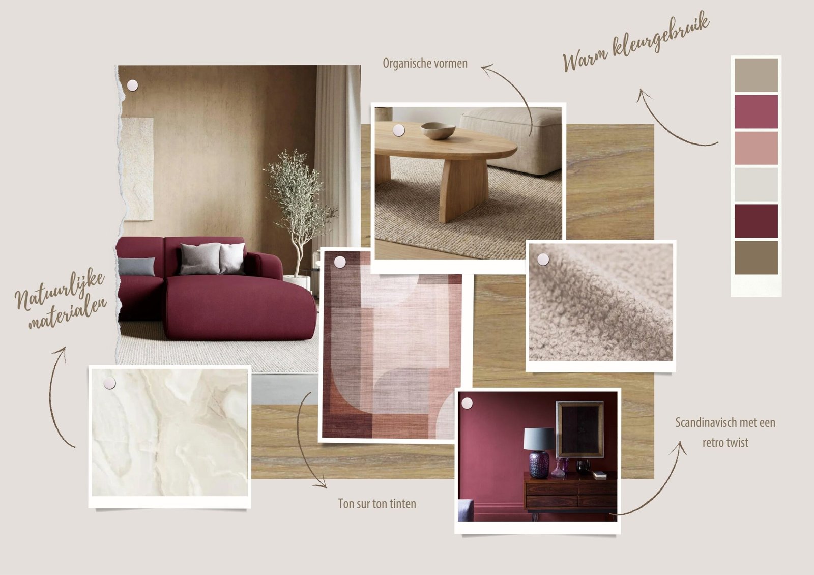 Voor dit interieurproject ontwierpen wij de woonkamer en keuken van een moderne villa in een landelijke omgeving. Door te werken met zachte beige tinten, licht eikenhout en Scandinavische invloeden ontstond een rustig en verfijnd interieur. De accentkleur bordeaux voegt diepte en warmte toe en zorgt voor een subtiel, stijlvol contrast.